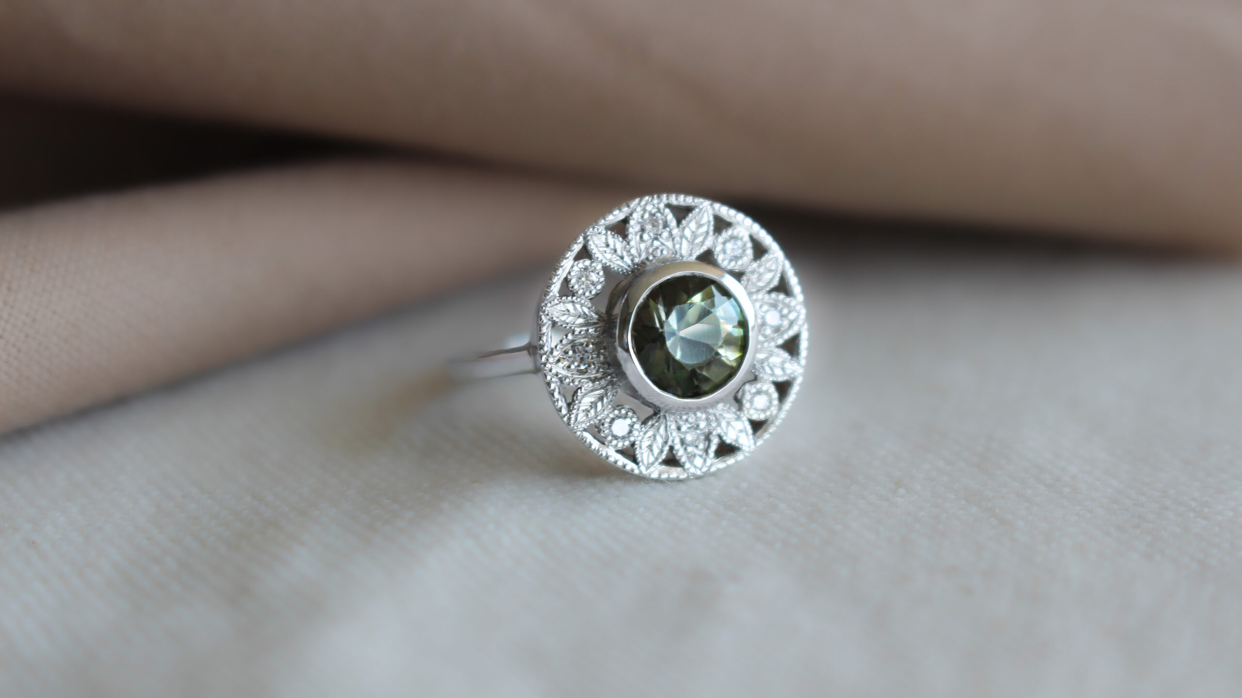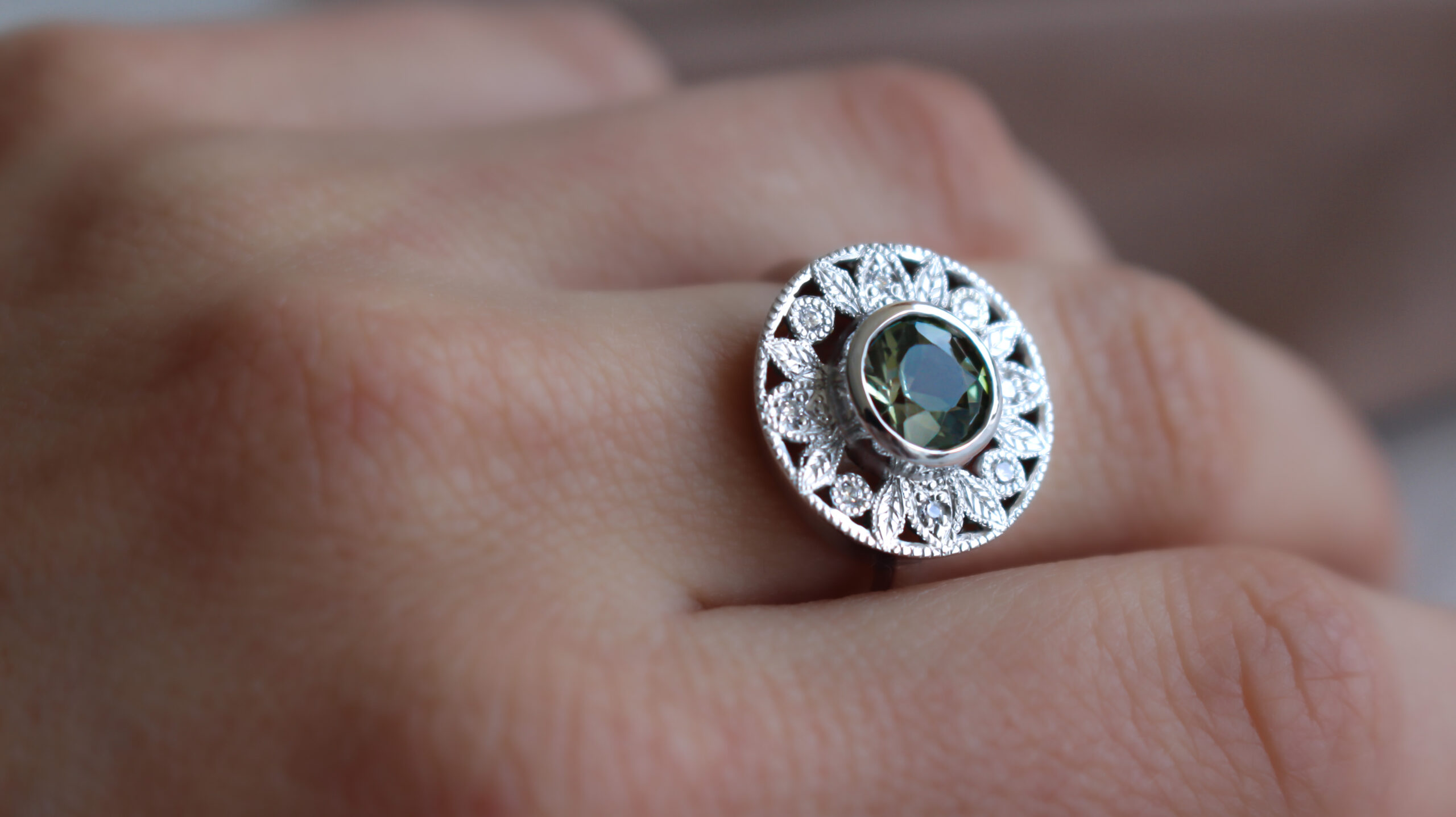 Anillo de platino con turmalina central y pequeños diamantes que acompañan la formas florales. metal: Platino