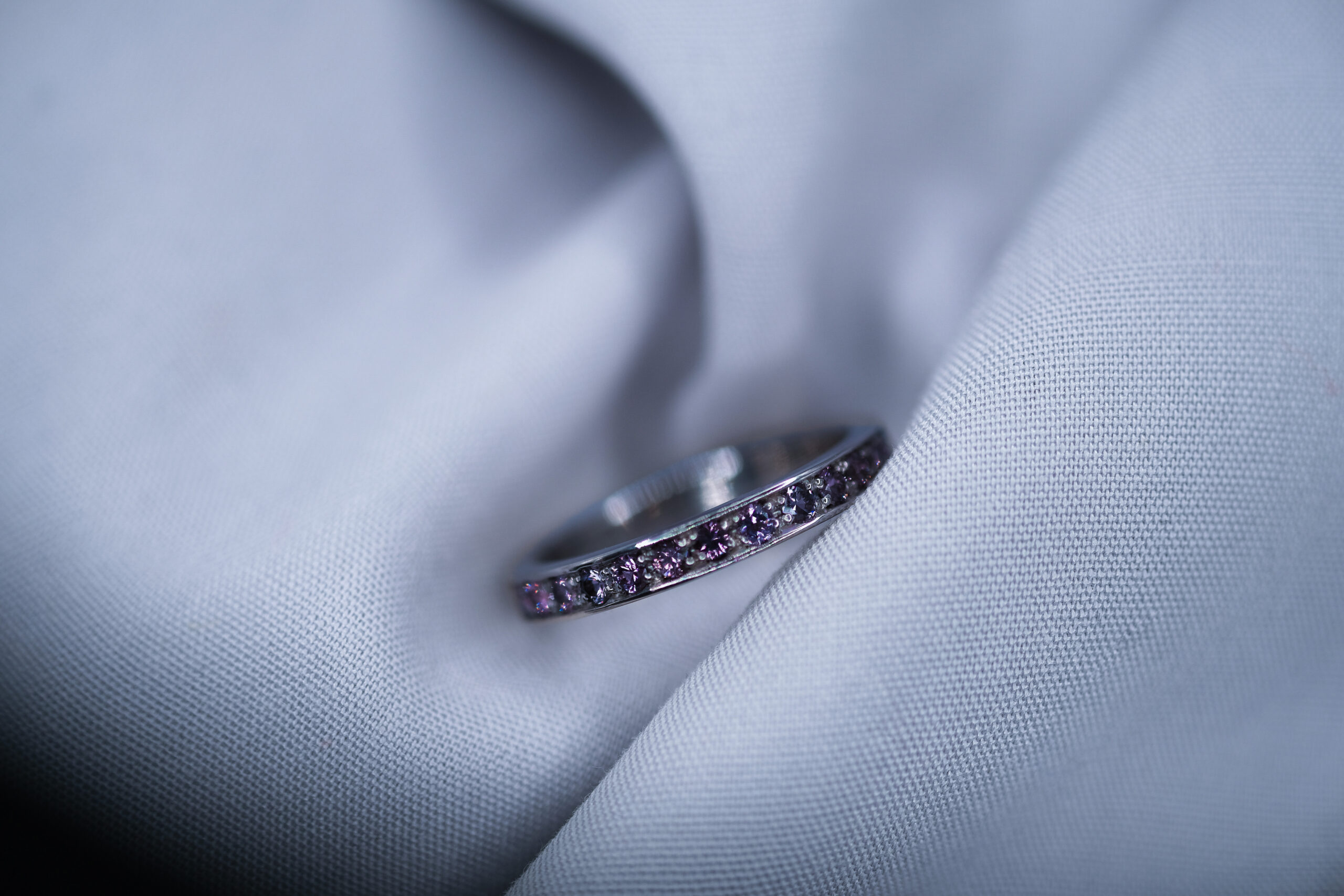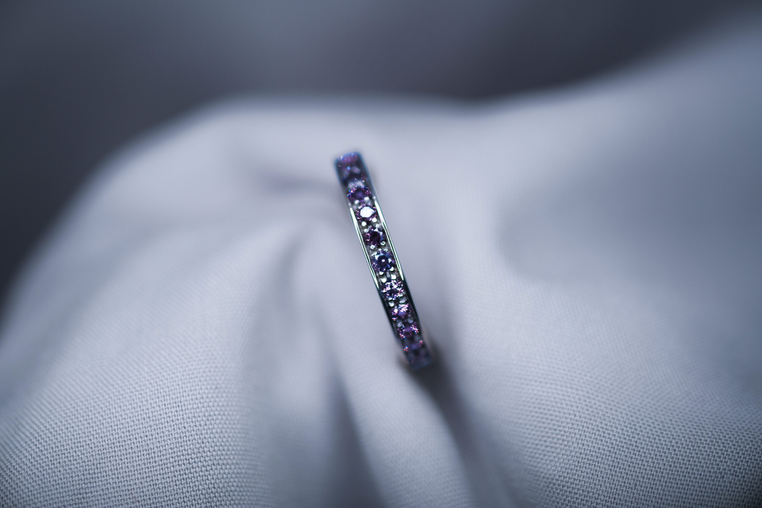 anillo tipo medio cintillo de oro blanco y espinelas lilas, un clasico con un toque de innovacion.