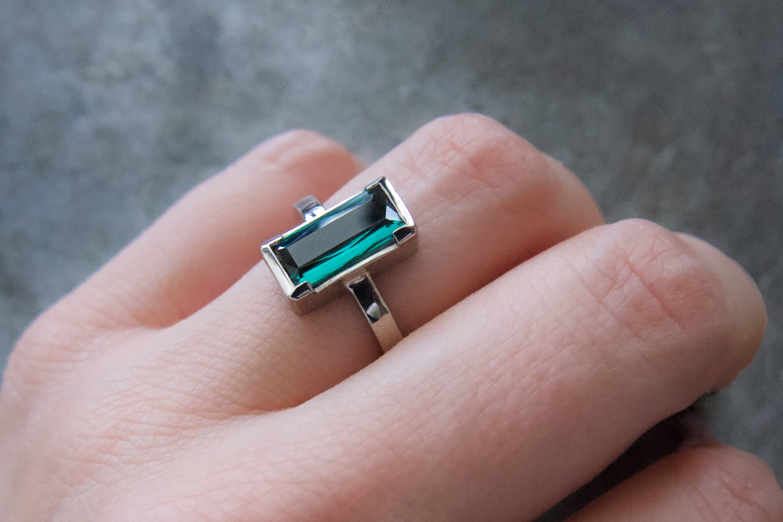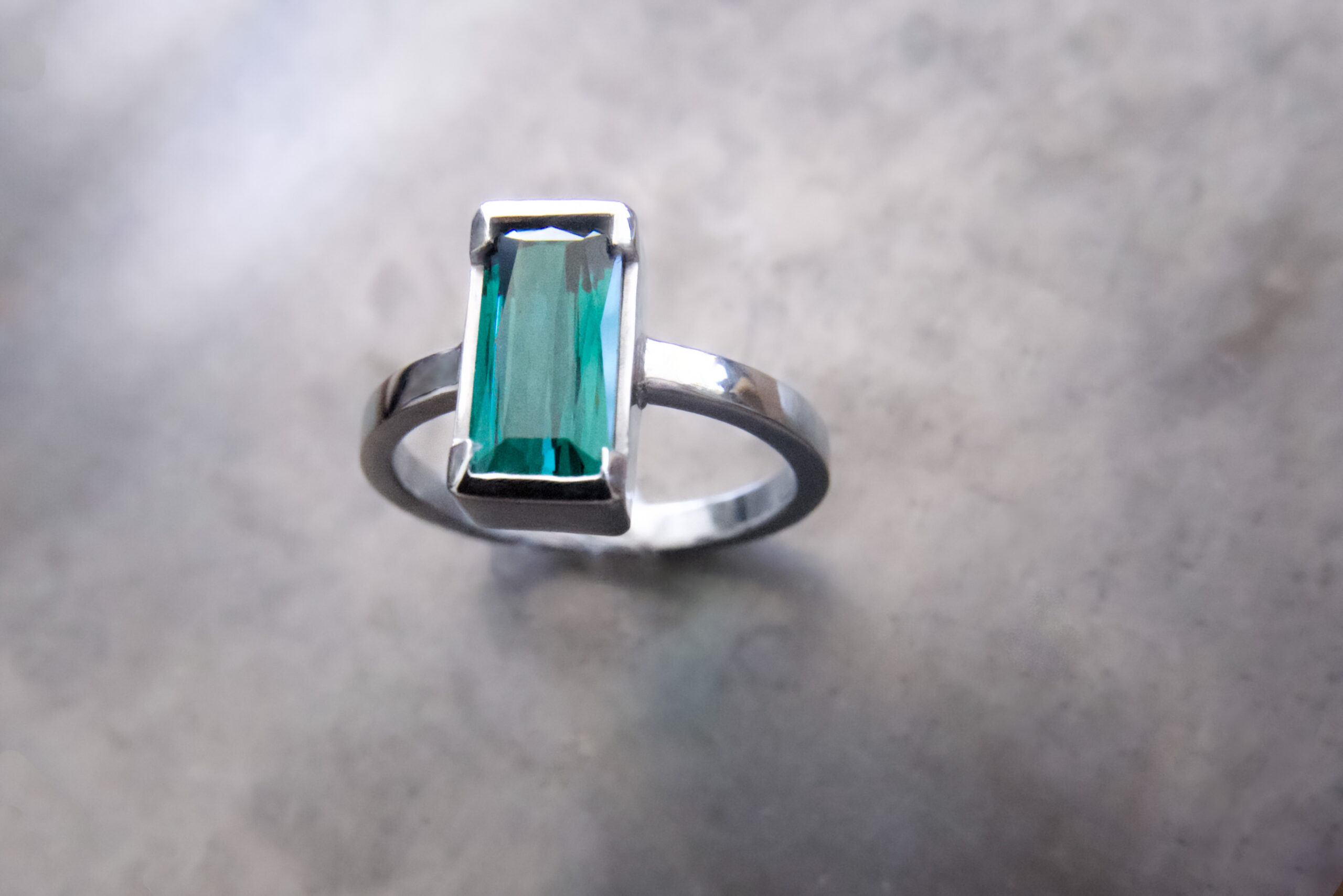 Anillo en oro blanco de 18k con un diseño minimalista. La piedra central es una turmalina rectangular. Ideal para quienes buscan una joya moderna y sofisticada con un toque de color vibrante metal: Oro blanco 18k