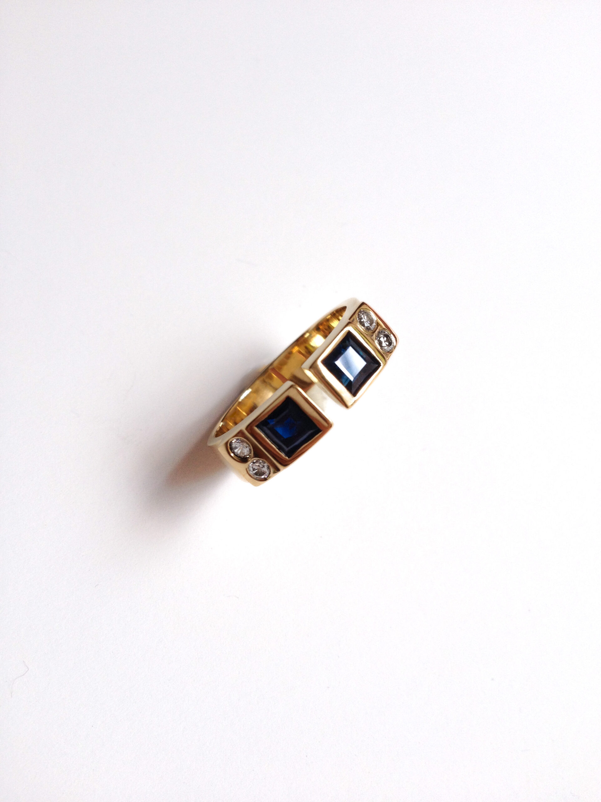 Anillo de oro amarillo de 18k con un diseño moderno y simetrico. Cuenta con dos zafiros cuadrados engastados bajo relieve, acompañados de pequeños diamantes. Una pieza única y elegante que destaca por su combinación de líneas limpias y colores intensos. metal: Oro Amarillo 18k