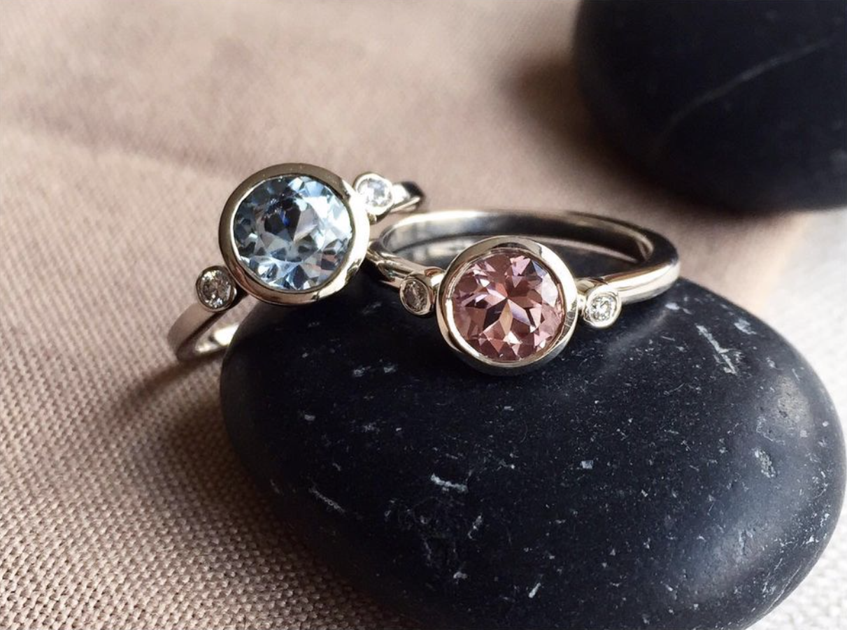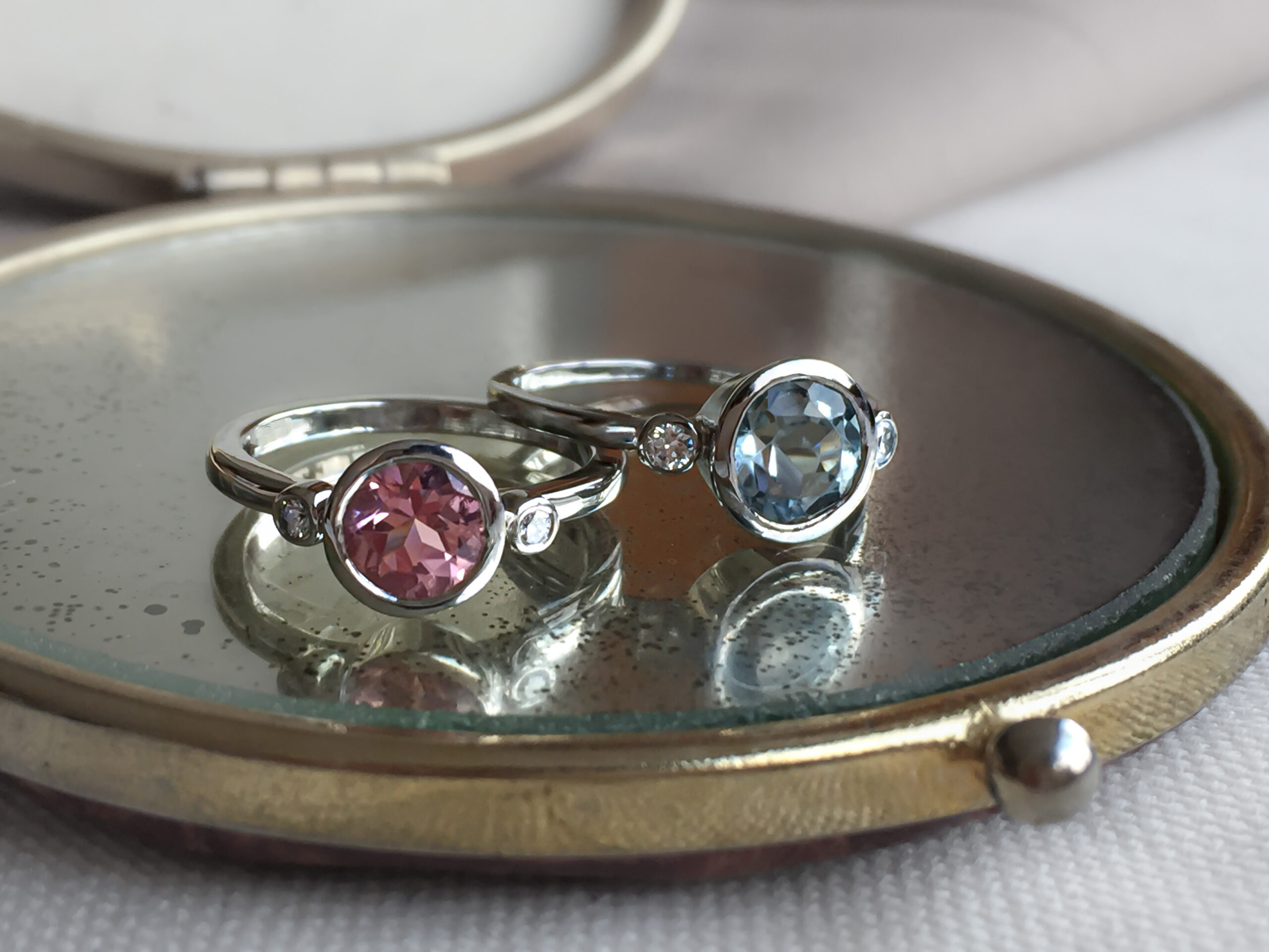 Anillos trio de piedras con una brillante piedra central acompañada de pequeños diamantes en engastes en bisel.