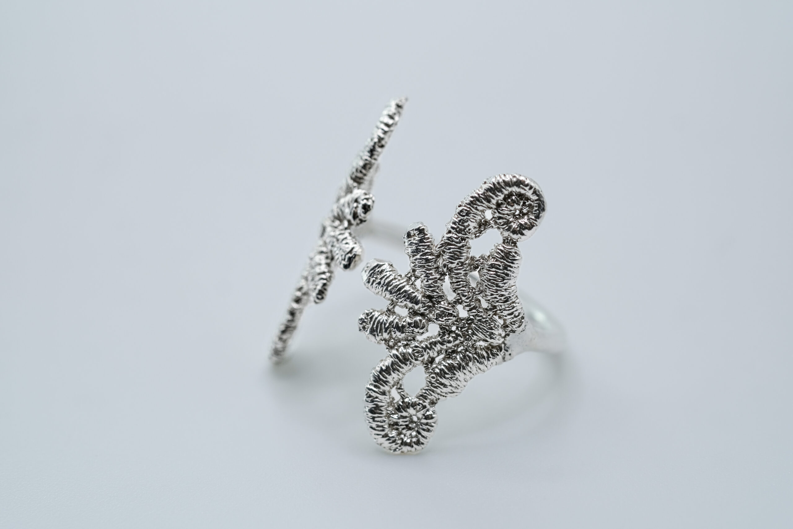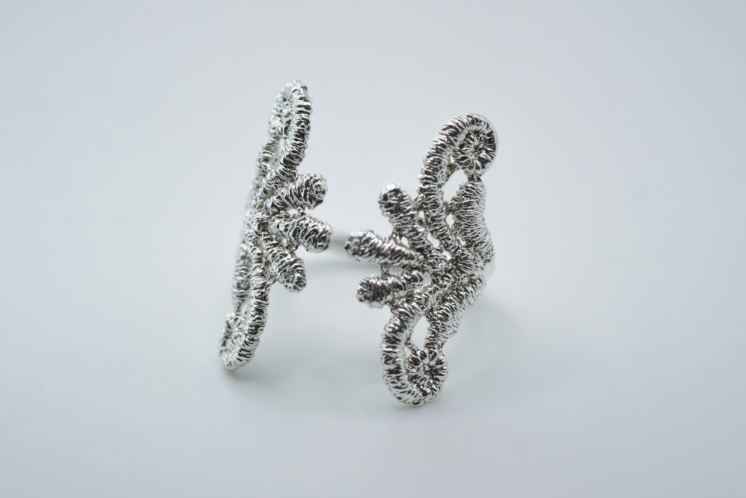 Anillo de la colección BRODERIE , con un elegante diseño de inspiración victoriana gracias a sus delicados scrolls, está hecho 100% de plata 950 y recrea la textura de una cinta de macramé de algodón. Una pieza versátil que añade un toque de sofisticación a cualquier look.