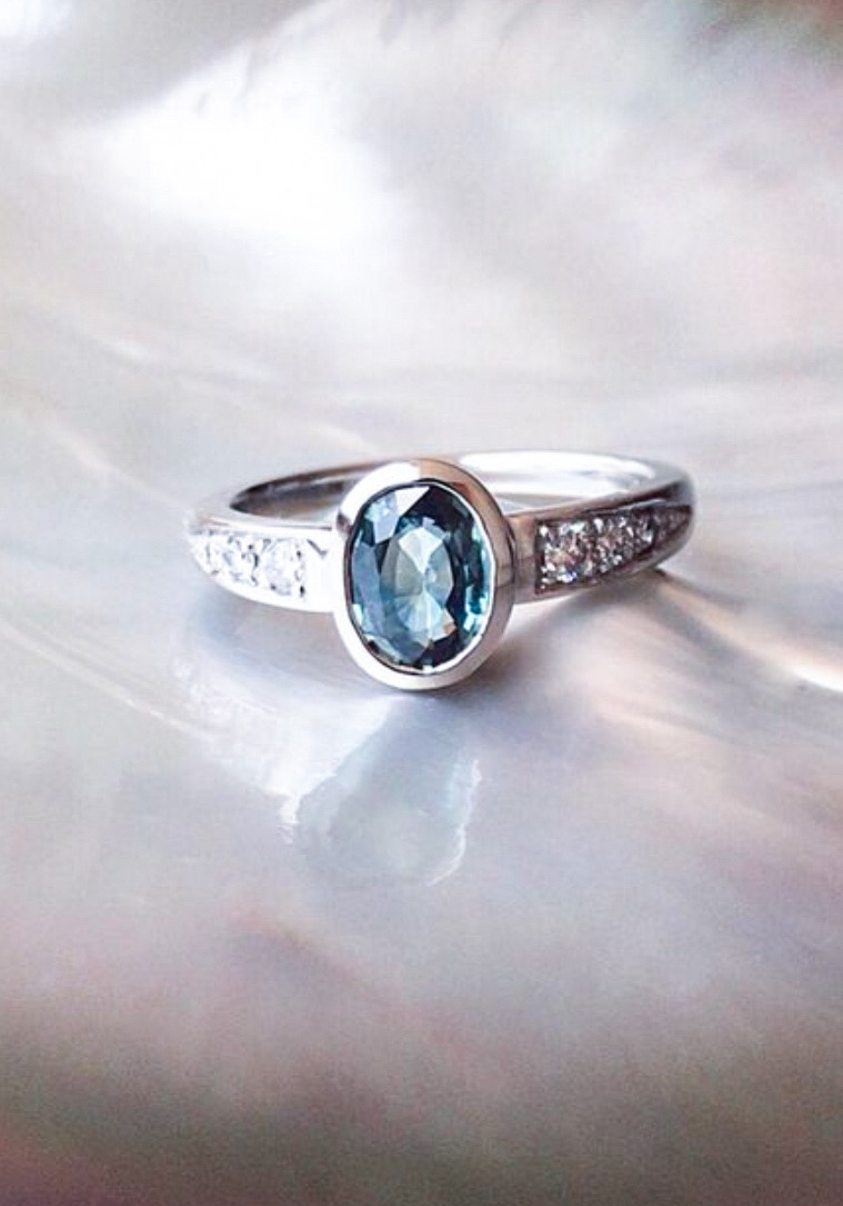 Este precioso anillo, hecho en oro blanco de 18 kilates, tiene como piedra central un zafiro mermaid ovalado en tonalidades azuladas. A cada lado, tiene engastes de brillantes en degradé de tamaño. Metal: Oro blanco 18k