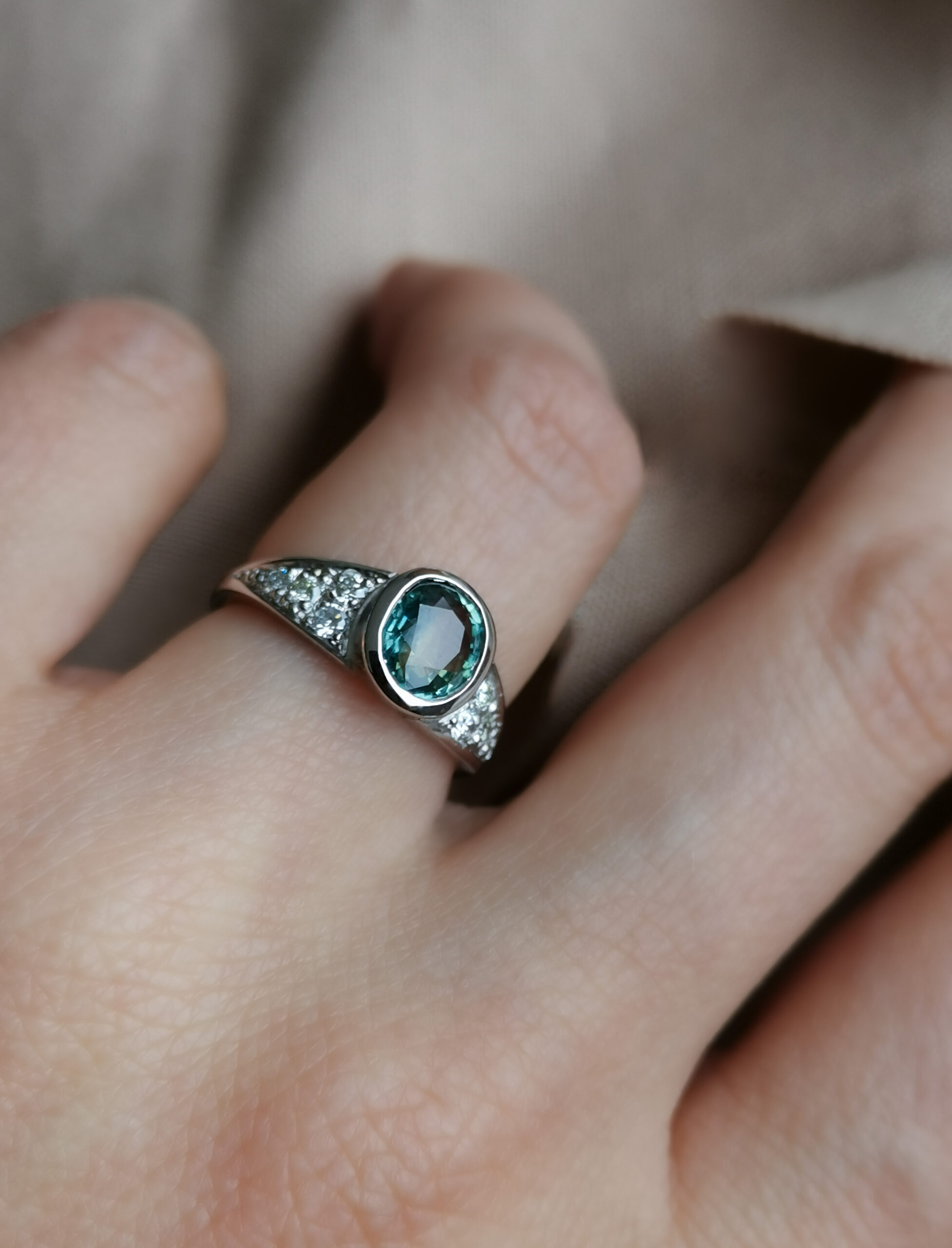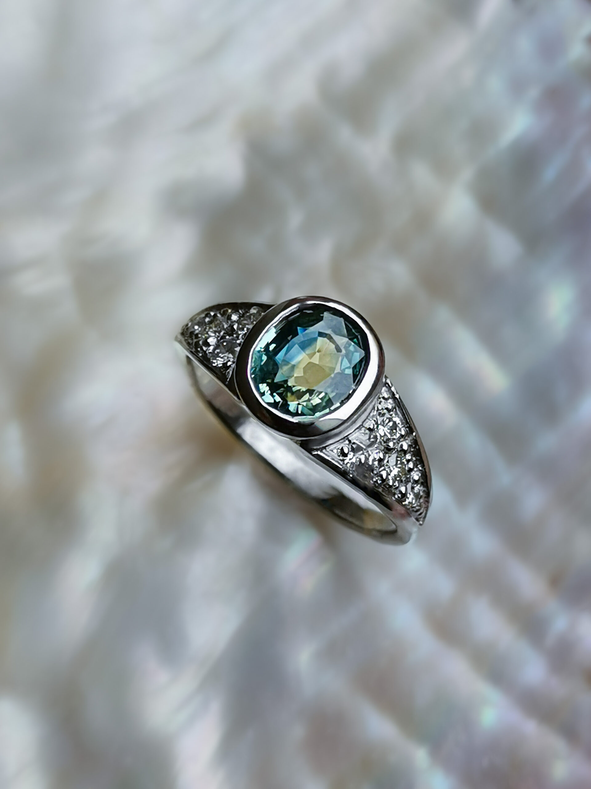 Este precioso anillo, hecho en oro blanco de 18 kilates sin rodinar, tiene como piedra central un zafiro mermaid ovalado en tonalidades verde-azuladas. A cada lado, tiene engastes de brillantes en degradé de tamaño.