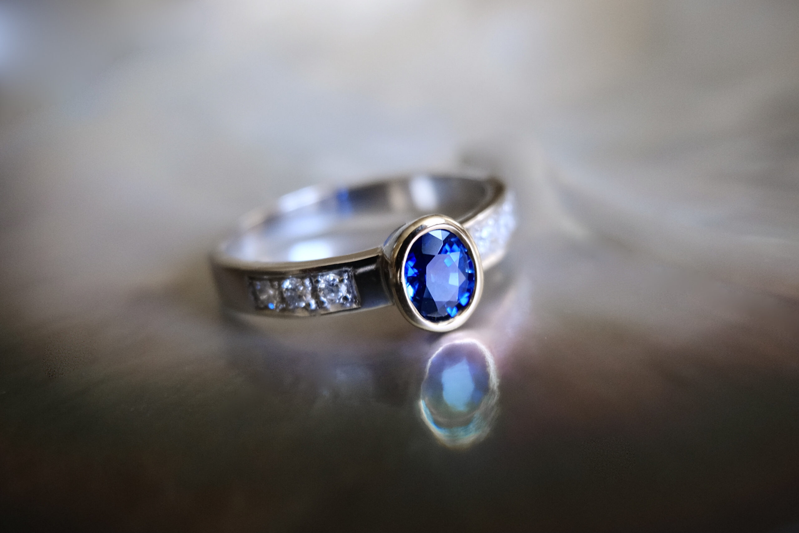 anillo con zafiro central engastado en un bisel de oro amarillo, el cuerpo del anillo es de platino con diamantes a los costados.