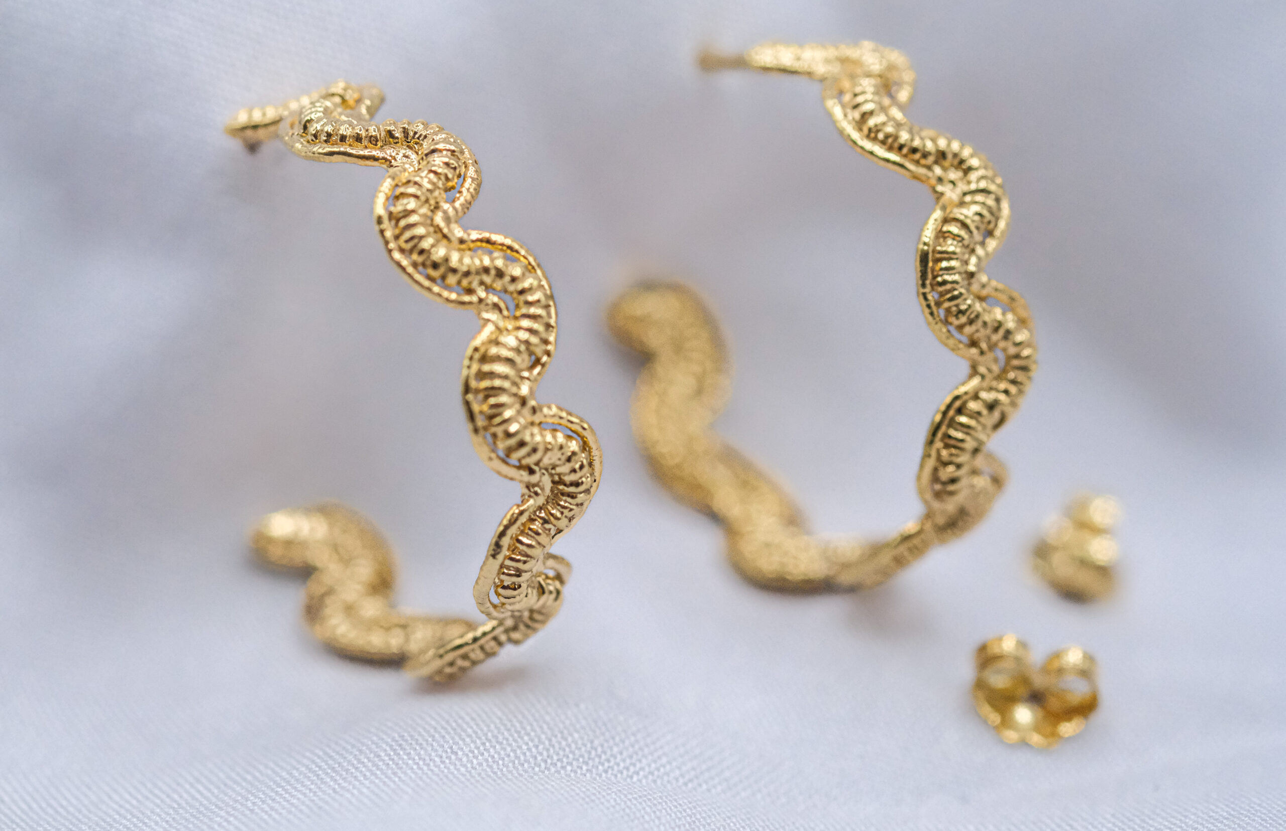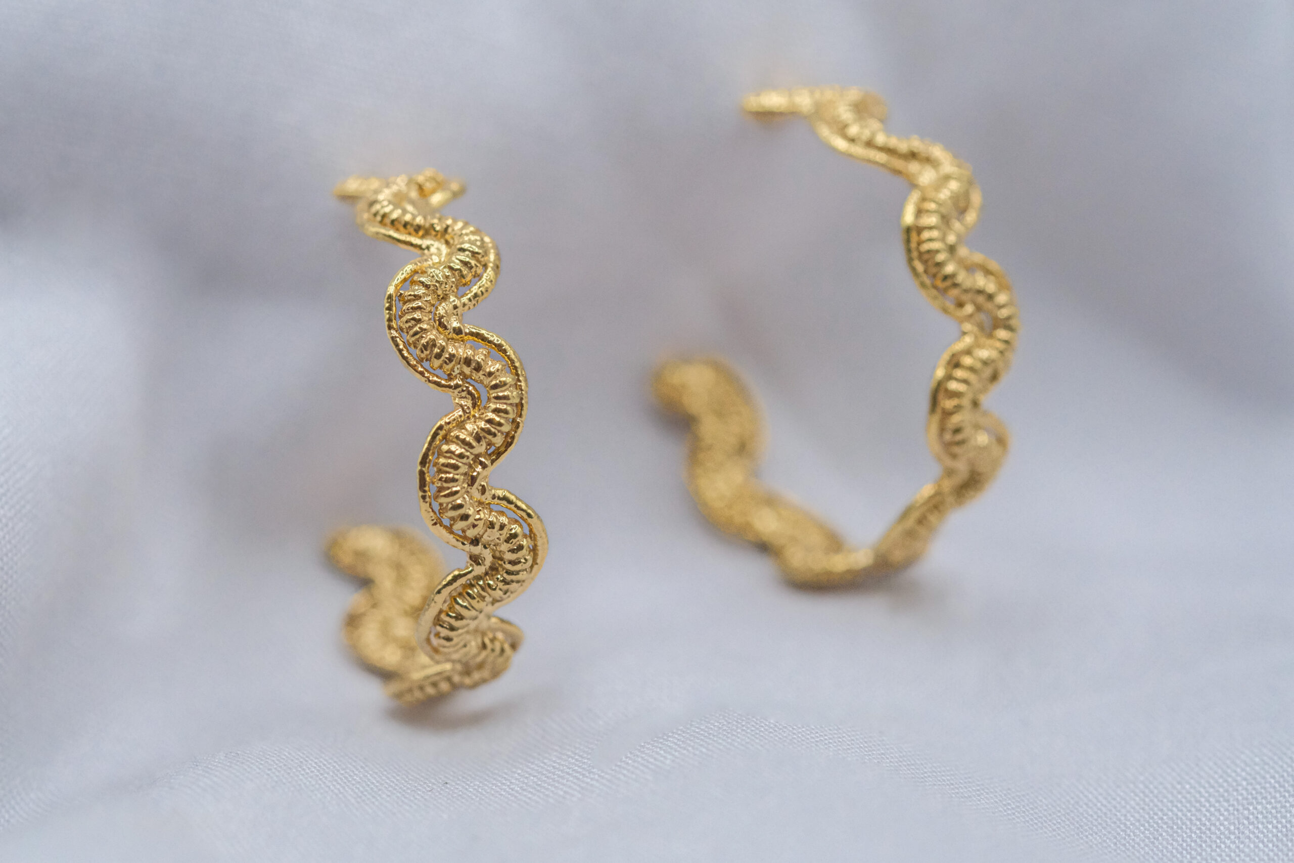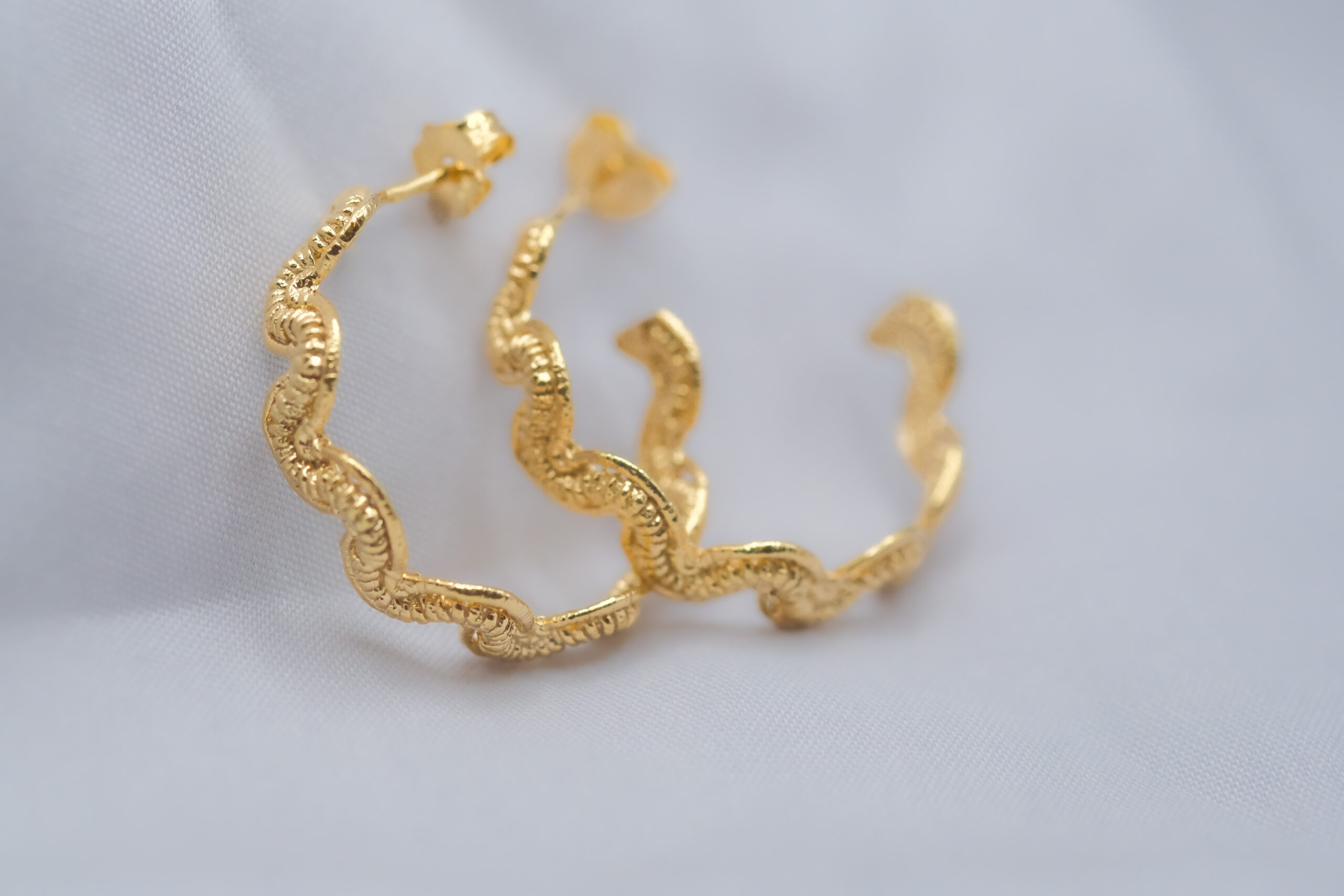 De forma ondulada, con una delicada textura. Enchapadas en Oro amarillo 18k. Argollas que salen de lo clasico, versatiles y ligeras. metal: Plata 950 Enchapadas en Oro amarillo 18k
