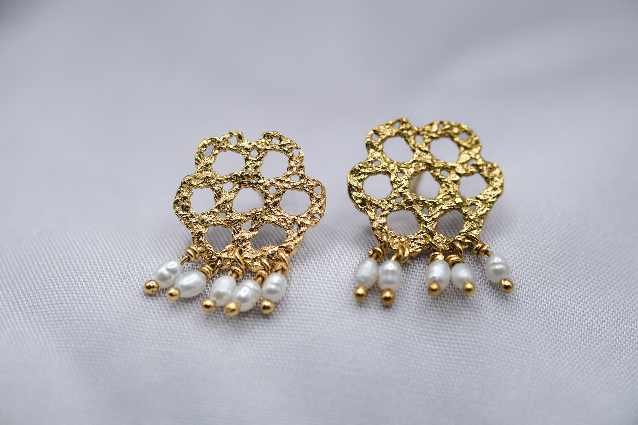 Estos aros son pura poesía. Su diseño que replica un delicado tejido con naveta, se combina con pequeñas perlas de rio blancas que cuelgan sutilmente para añadir un toque de movimiento y sofisticación. Son ligeros, pero con una presencia que no pasará desapercibida.