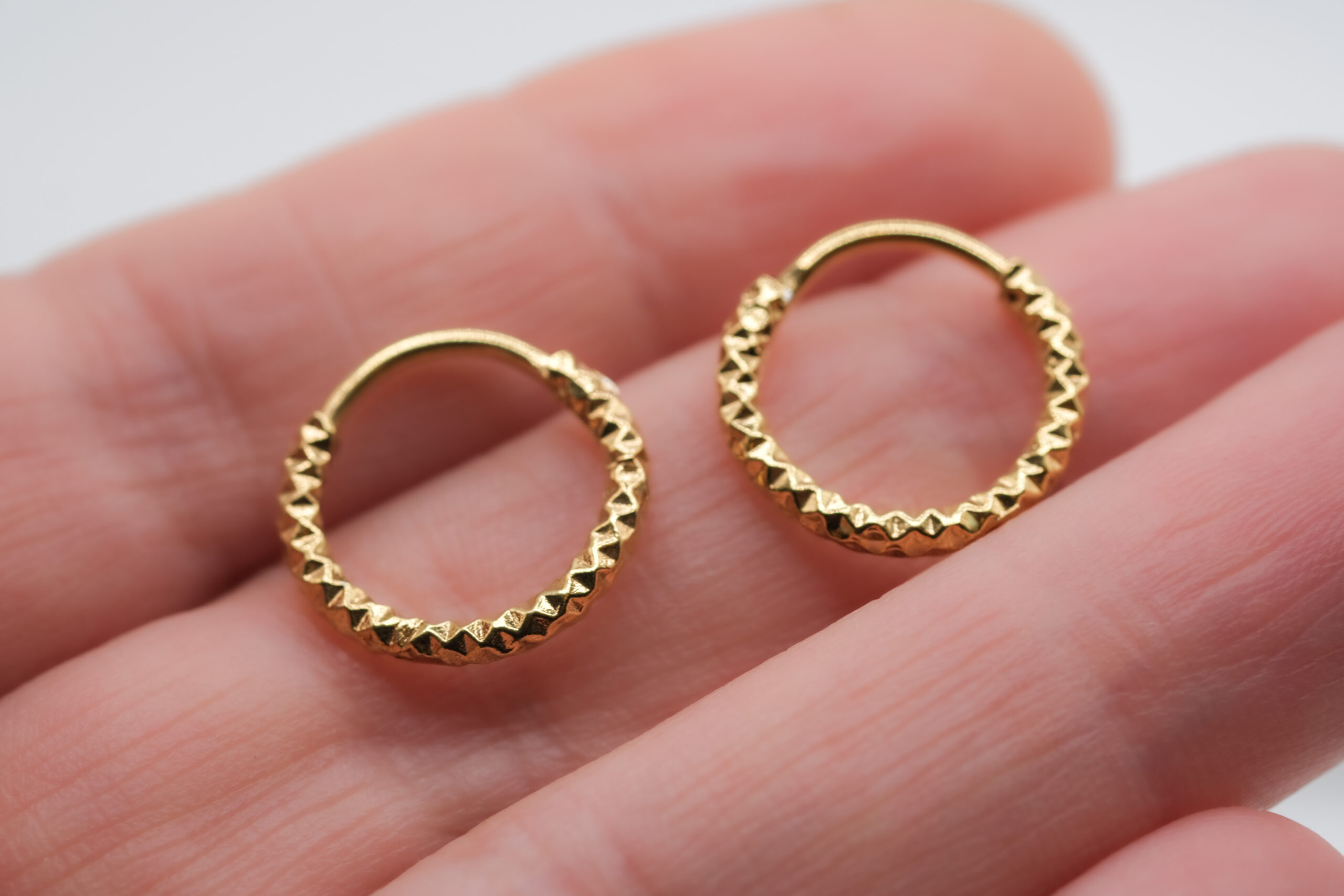 ¡Con estos aros háras el match perfecto! Con un diámetro discreto y un diseño facetado que reflecta la luz desde todos los ángulos, son ideales para quienes buscan un accesorio versátil y lleno de estilo que puedas usar casi sin sácatelos. Además quedan perfectos si quieres usarlos en un segundo aro.