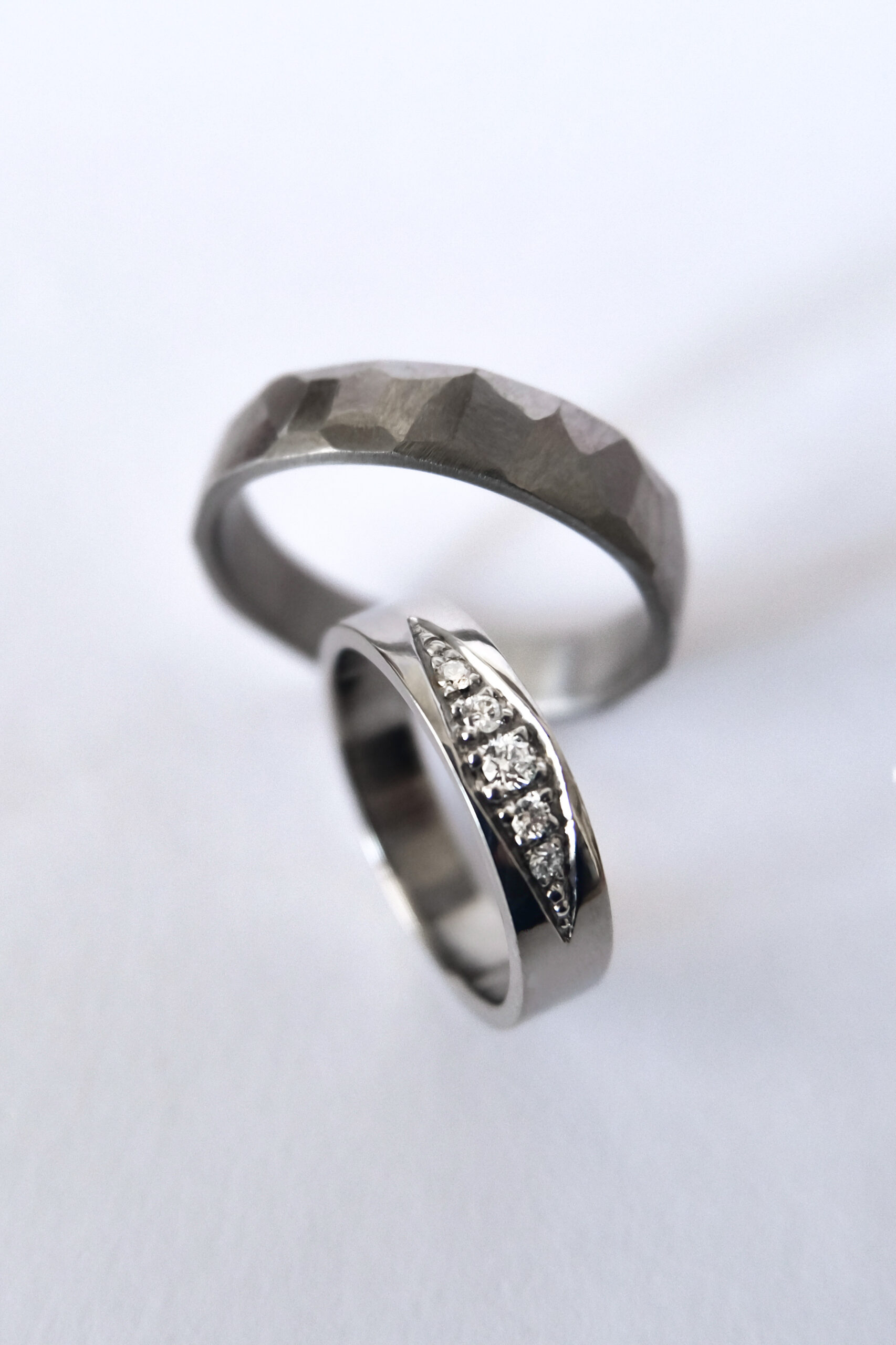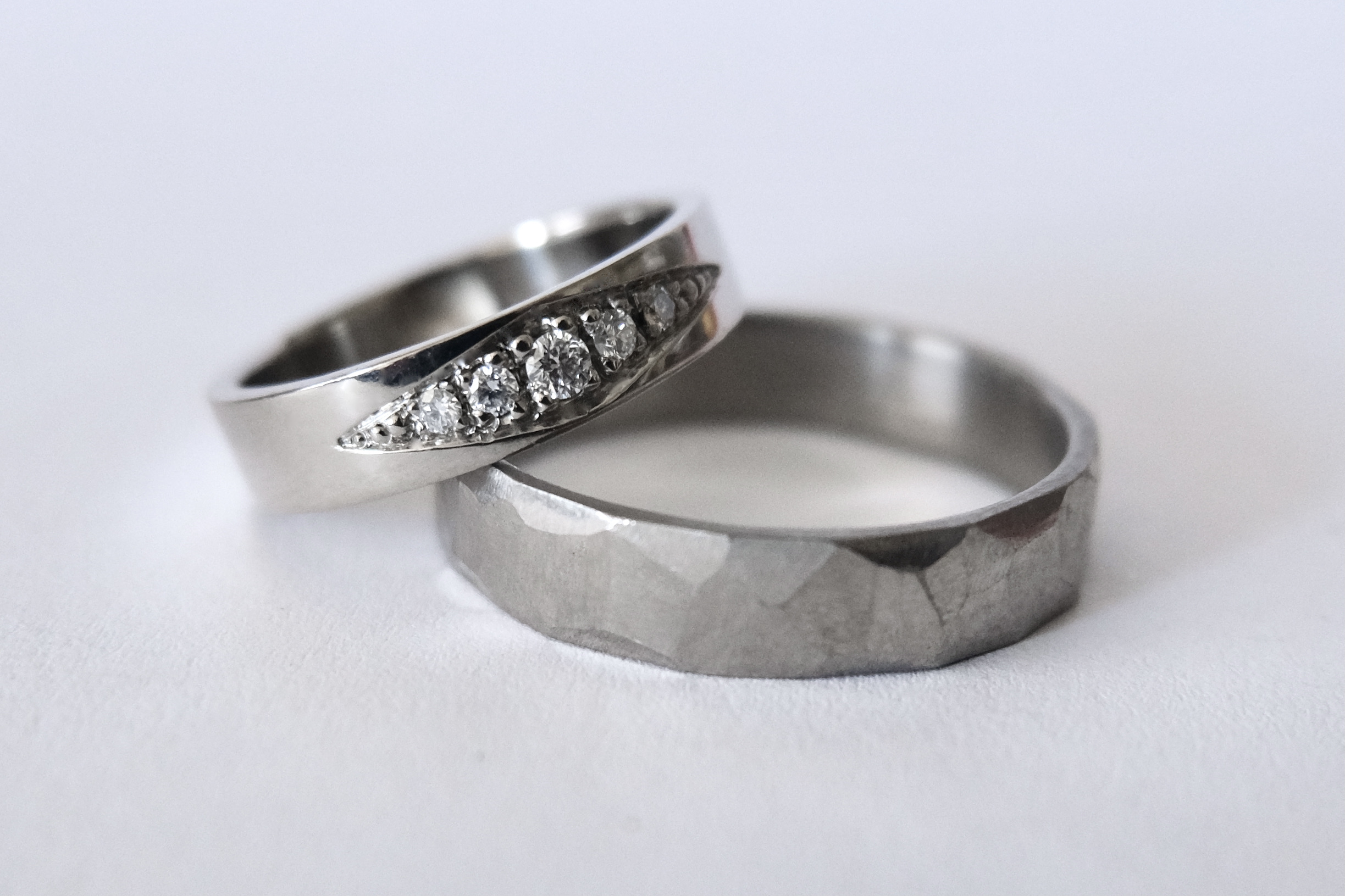 Esta argollas son un contraste entre dos estilos, una lisa con engaste de diamantes en degrade de tamaño y la otra tiene una textura martillada con facetas sutiles, con un acabado mate que le da un aspecto rústico.